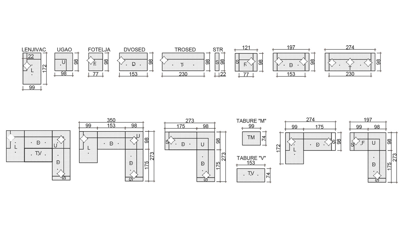 U modulaciju ulaze trosed, dvosed, fotelja, ugao, lenjivac i stranice.